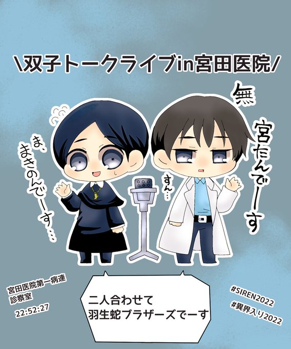 「村が消えた? 赤い海? 何を言ってんのや、牧野さん」「前田さんのとこの娘さんと見たんやて〜!ホンマやで宮たん!「誰が宮たんや」 #双子トークライブin宮田医院 #SIREN2022 #異界入り2022 #異界入りイラスト展