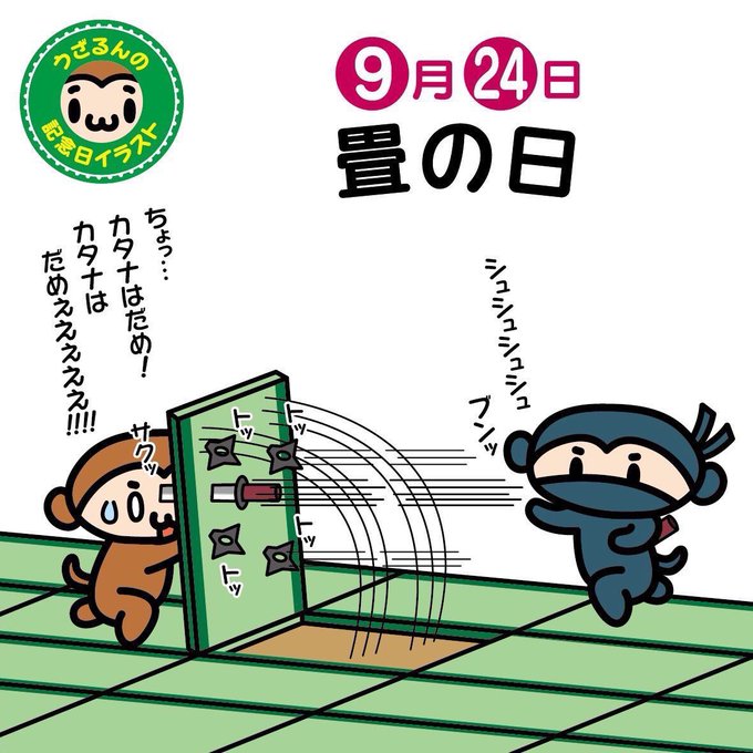 9月24日は畳の日。最近は和室がないお家も多いですよね。忍者が忍び込んで襲ってきても、畳がないから畳返しができない!…とお悩みのご家庭もあるでしょう。1枚だけでもあると安心ですよ。今日は清掃の日でもあるので畳をきれいにするのもいいかも〜 #畳の日 #清掃の日 #イラスト好きな人と繋がりたい