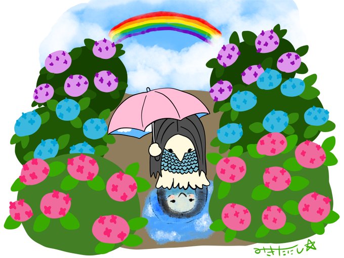 アマビエ様「水たまりを覗き込むのは楽しいですねー😊」 アマビエ様❗️後ろ後ろ❗️虹🌈が出てますってば🤣気がついて〜❗️ #アマビエチャレンジ #アマビエみきたにし #イラスト #イラスト好きさんと繋がりたい #癒されたらRT #AdobeFresco #傘 #紫陽花