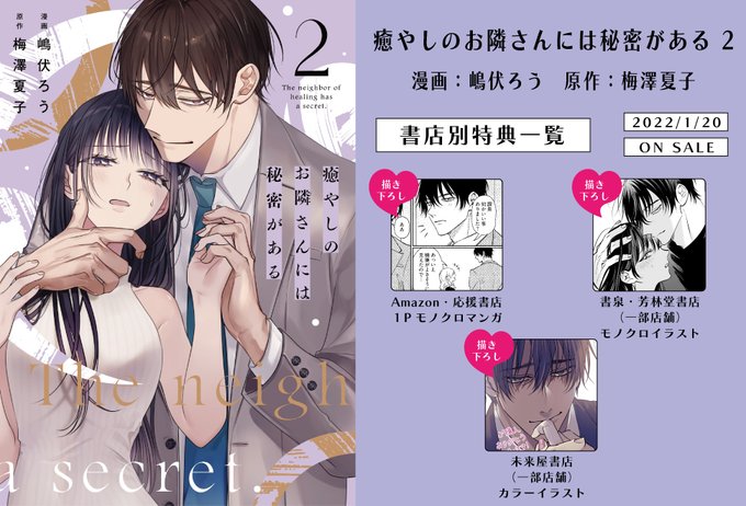 🌸2023年1月20日(金)発売🌸 『#癒やしのお隣さんには秘密がある 2』 原作:梅澤夏子先生[@natsu8story] 特典情報が公開されました❣ 描き下ろし漫画・モノクロイラスト・カラーイラストがあります💞 未来屋書店さま限定の詳細は下記です👇 mibon.jp/comipre/685/ 発売までお待ちくださいませ✨