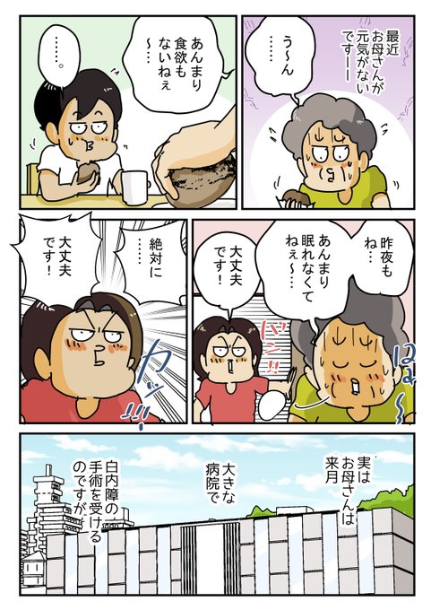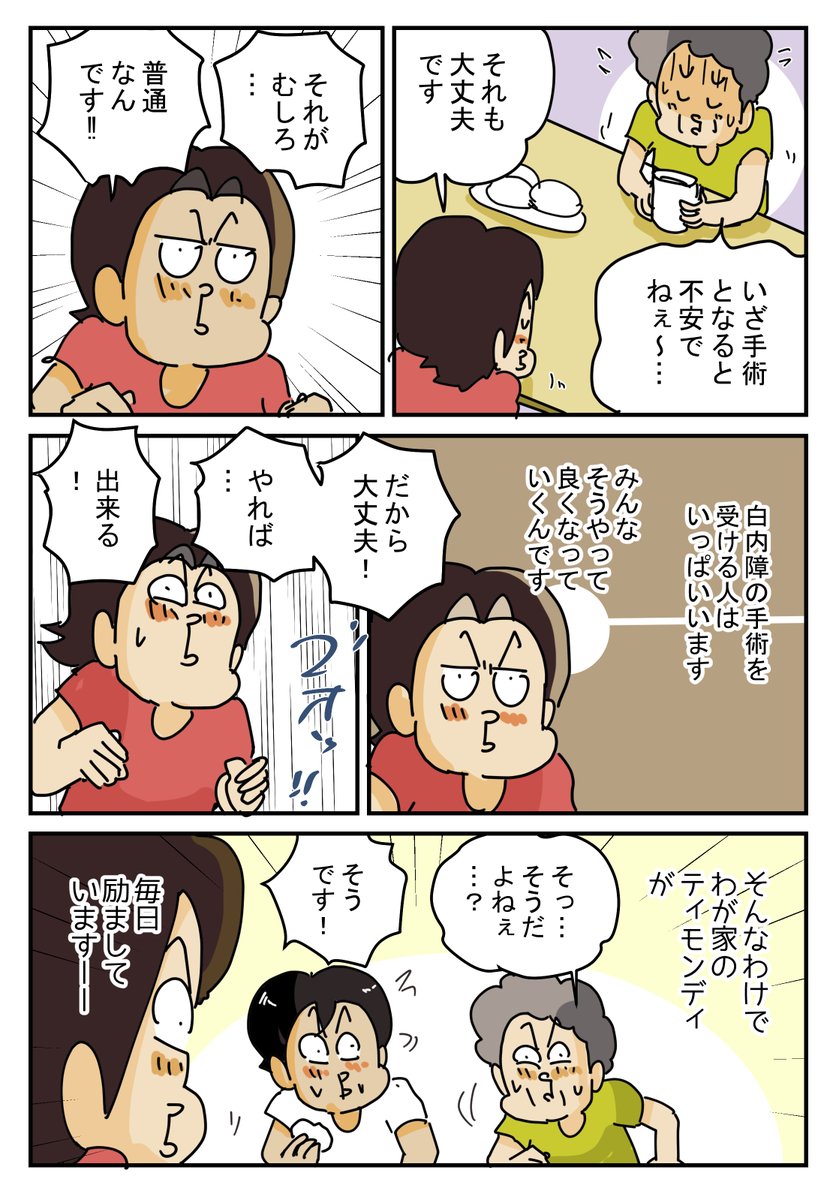 『勇気を出して お母さんの手術』 白内障の手術を受けるお母さんを、わが家のティモンディが毎日励ましております、、 #白内障 #お母さん #手術 #コミックエッセイ #漫画が読めるハッシュタグ ブログはこちら↓ ameblo.jp/yukitanoyonkom…