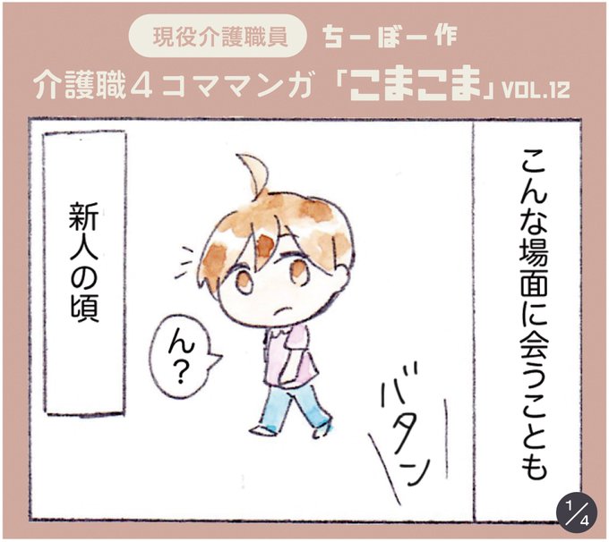 介護職4コママンガシリーズ第12弾! 白十字会の現役介護職員が描いた、4コママンガシリーズです!新人の頃は突発的な対応に慣れていないものです。そんな時も落ち着いている先輩って、輝いて見えますよね! #白十字会 #可愛いと思ったらRT #イラスト #介護職 #あるあると思ったらRT #先輩