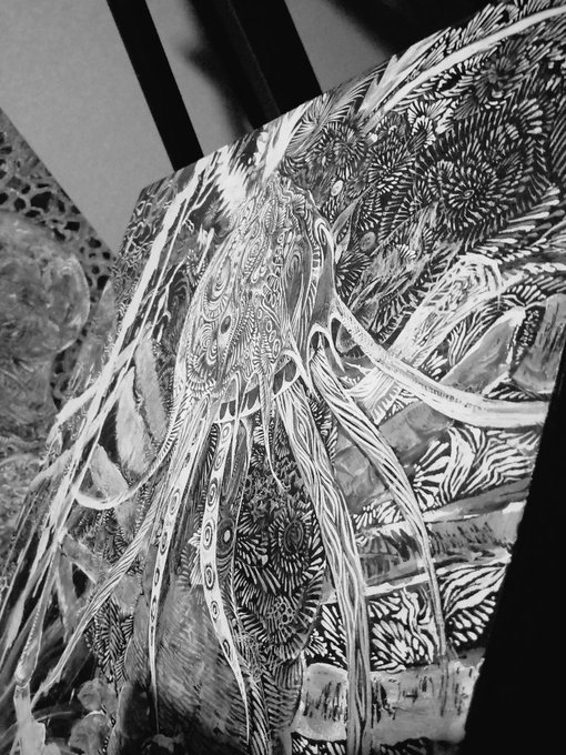 #三億アカウントの中から私を発掘してください 画像1.「曙を連れて行け」 画像2.「連作粘膜 伊邪那岐」 画像3.「狂言 釣狐より-白蔵主-」 画像4.「Helter skelter,」 産まれた時から絵描きやってます。 #白墨画 #赤城美奈 #LowblowArt #細胞骨格表現粘菌画家