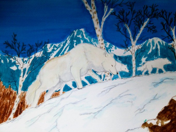一週間ぶりに絵を描きました。 祖父への誕生日プレゼント。 タイトルは、『白狼と夜空』。 星空を背景に白狼が遠吠えしているところを描きました。 かなりいい作品になったと思います。 沢山の方に観ていただきたいです。 #白狼 #星空 #水彩画 #絵描きさんと繋がたい #拡散希望RT協力お願い致します
