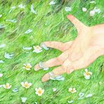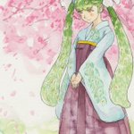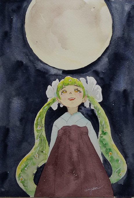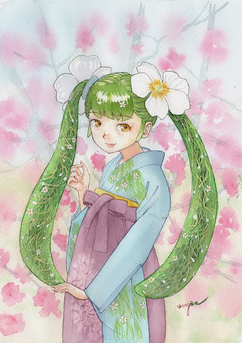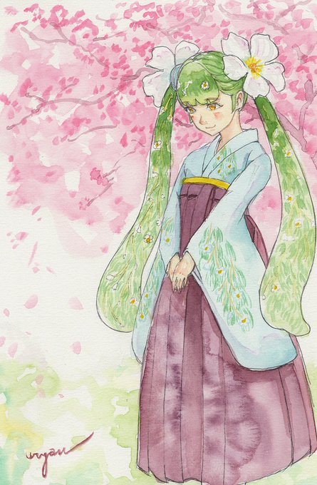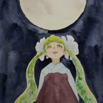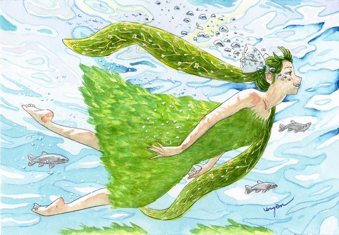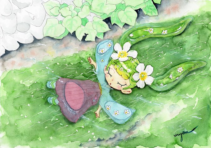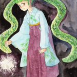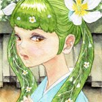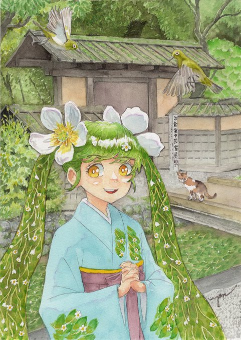 「白石梅花藻姫と猫」 白石梅花藻姫が側にやってきた黒猫とお話しをしてるところを描いてみました! #オリジナルイラスト #白石梅花藻姫 #梅花藻 #白石市 #掘割 #片倉家中旧小関家武家屋敷 #透明水彩 #Watercolor #水彩画 #水彩 #アナログイラスト
