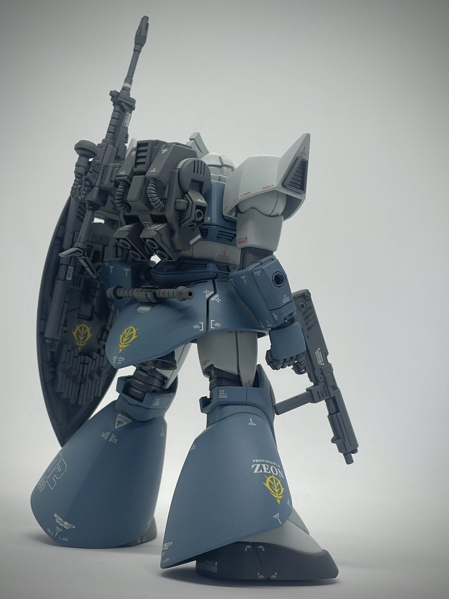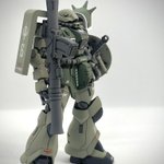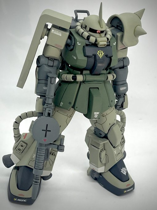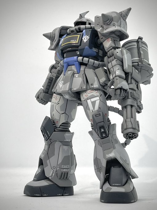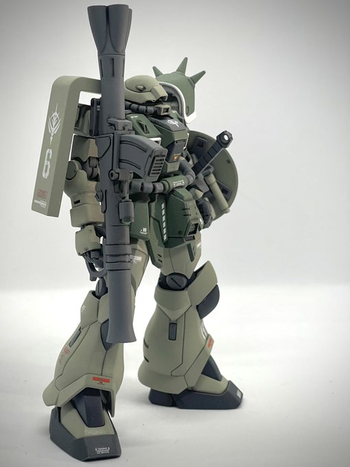 #白背景でも撮ってみた カラーレシピは引用元に😭 名もなきエースが駆る06Rというオラ設定で作りました😭 ベースはF2、ランドセル・前垂れ・スネはHGMSVのシンマツ、太腿はオリジン系ザク、マシンガンはシステムウェポン😭 僚機のドムとカラーリング合わせております😭 twitter.com/gajumaru_museu…