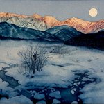 #みんなで楽しむTwitter展覧会 #art #ArtistOnTwitter #illustration #イラスト #Watercolor #水彩 #透明水彩 #白馬 #モルゲンロート 冴ゆる有明の月と、 薄紅に染まるアルプス。 新しい一日が静かに明けていく、 白馬の朝です。