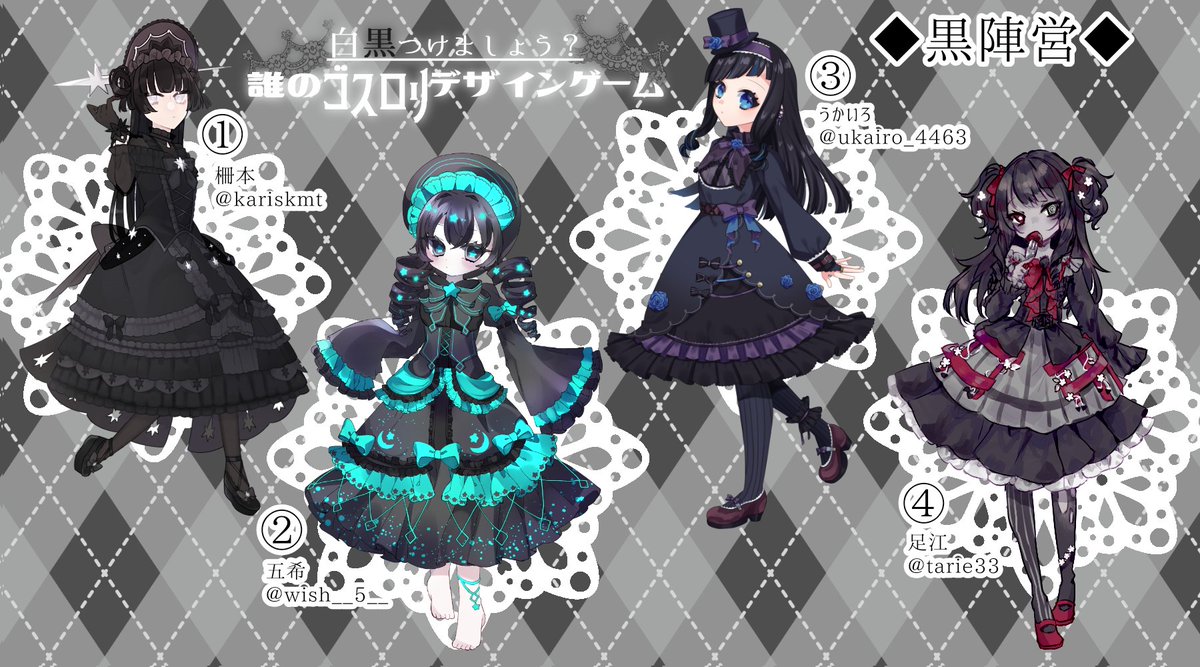 【#白黒ロリータ誰デザ】 足江さん主催の誰デザ企画に参加させていただきました! 私は黒陣営の1の子を描かせていただきました🖤 アンケートをツリーに繋げますので、私のデザインを是非当ててみてください……🤍🖤