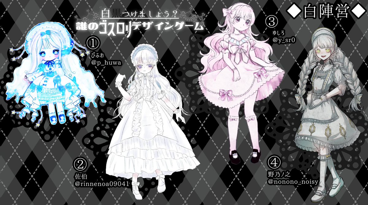 【#白黒ロリータ誰デザ】 足江さん主催の誰デザに参加させていただきました! 白黒陣営に分かれてカワイイで殴り合え! ゆしろは白陣営3番の子を描かせていただきました アンケ繋げますのでどの子をキャラデザしたか当ててみてくださいー