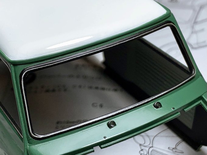 #皆さんのマスキング塗装見せてください 旧車につきもののウィンドウモールはマスキングテープをシルバーに塗って極細切りにして貼ってます。まさにマスキング塗装😅 これだといくらでもやり直しができるし細いので曲線もスムーズです。フィニッシュシリーズは伸縮して貼りにくいので苦手です。