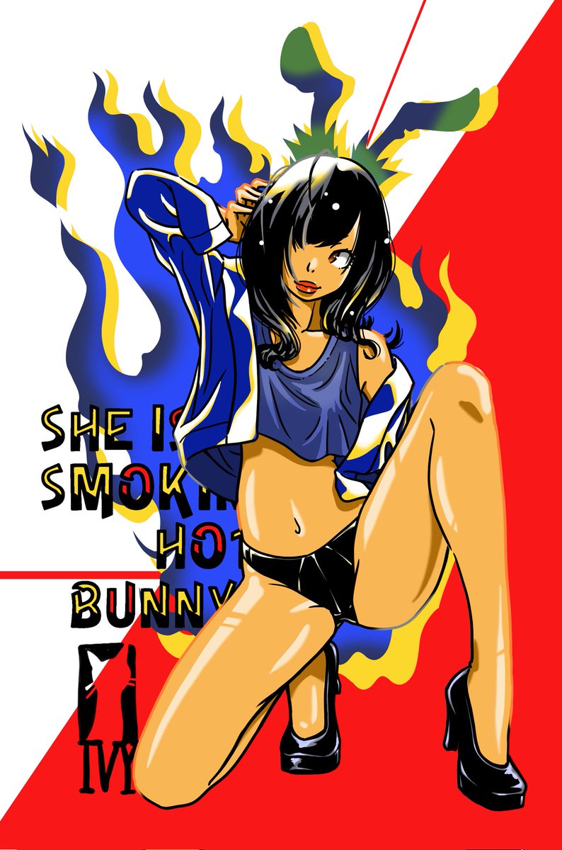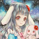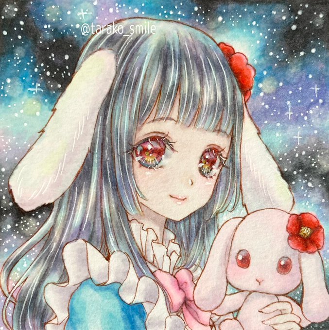 💎#君のスパークルサイン💎 豆色紙に『ロップイヤー』ちゃんまた描きました🐰 #君スパ に追加納品していますので、よろしくお願いします✨ 椿の花のつもりで描いたけどハイビスカスっぽい?🌺😇 #皆さんの描く黒髪の塗り方が見てみたい 黒髪は好きだけど難しいです💦 #コピック