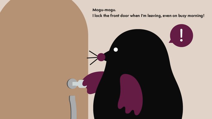 モグモグ〜!忙しい朝も、玄関の鍵はしっかりかけるよ! #盗難防止の日 #モグハル #Moguharu #もぐら #キャラクター #character #イラスト好きな人と繋がりたい #イラスト #illustration #デザイン #mascots