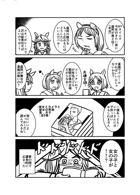 愉快なユキノビジン漫画018 カノカメ #ウマ娘プリティーダービー #ユキノビジン(ウマ娘) #ゴールドシチー(ウマ娘) #ウイニングチケット(ウマ娘) #岩手県 #盛岡市 #彼女とカメラと彼女の季節 pixiv.net/artworks/10476…