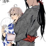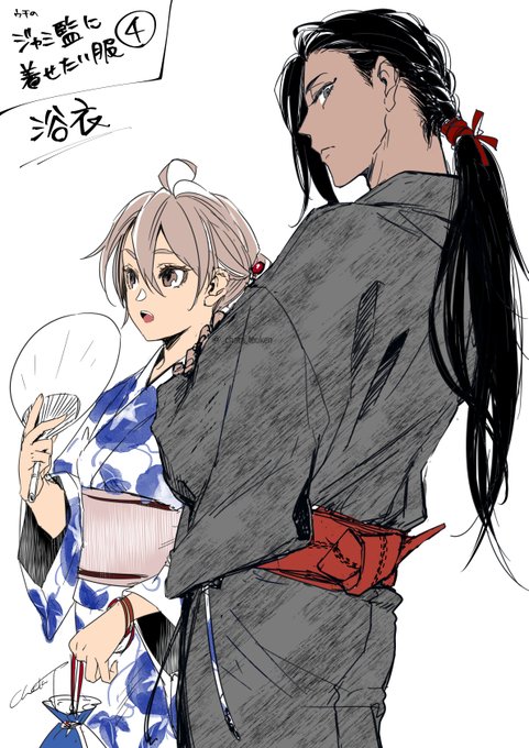 うち監に着せたい服 その④ 浴衣(ジャミ監♀) 良さげな浴衣女子に視線を向けたら隣の長髪とんでもイケメンに凄い睨まれてヒェってなるモブ視点の夢絵になりました #twstプラス #監ちゃんに着せたい服