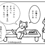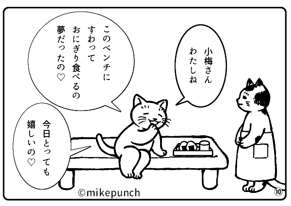おにぎり猫のものがたり 第十話 いつものお客さま note.com/mikepunch/n/nb… mikepunch.net/onigirinekosta… いつもはおにぎりをお持ち帰りになる常連のお客さま。 今日は「ベンチで食べたいの」と仰います。 #おにぎり猫のものがたり #看取り #自分をもてなす #漫画が読めるハッシュタグ #サブスク漫画