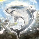 獲物を目の前にしたホホジロザメと、世界的なスーパーモデルのヨシキリザメ。 ホホジロザメの代表作がジョーズなら、世界で最も美しいといわれるヨシキリザメの代表作はIKEAのサメのぬいぐるみかな。 #真夜中すぎの展覧会9 でお披露目です!! #イラスト #サメ