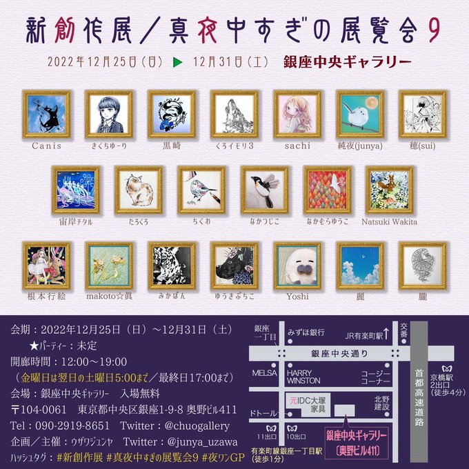 明日より 「#新創作展/#真夜中すぎの展覧会9 #夜ワンGP」 に参加させていただきます。 12月25日(日)~31日(土) 銀座中央ギャラリー様 来年の干支にちなんで、うさ耳ちゃん🐰中心に原画5点ほどになります。 他、過去絵のポスカなど🥰 お立ち寄り頂けたら嬉しいです 詳細🙏→twipla.jp/events/529700