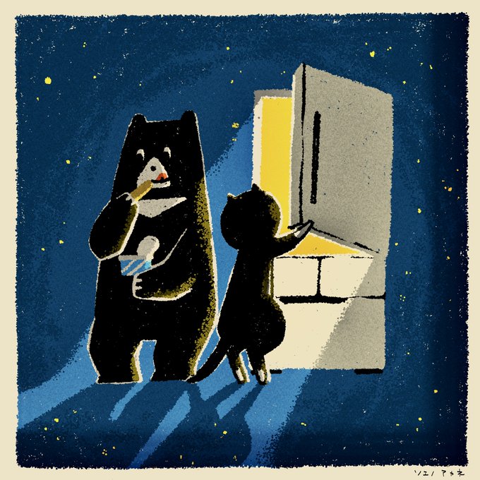 クマさんとネコさんと眠れない夜の冷蔵庫。 #イラスト #イラスト好きな人と繋がりたい #絵描きさんと繋がりたい #ゆるいイラスト #絵柄好みって人にフォローされたい #イラストレーター #ゆるい絵 #可愛い #眠れない