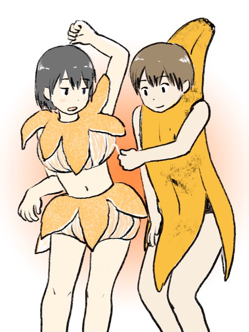 早起きお絵描き 「バナナさんに白いすじを取ってもらっているみかんさん」 なんか意図せずやらしい感じに仕上がってしまいました/// #イラスト好きさんと繋がりたい #絵描きさんと繋がりたい #Procreate #illustration #着ぐるみ