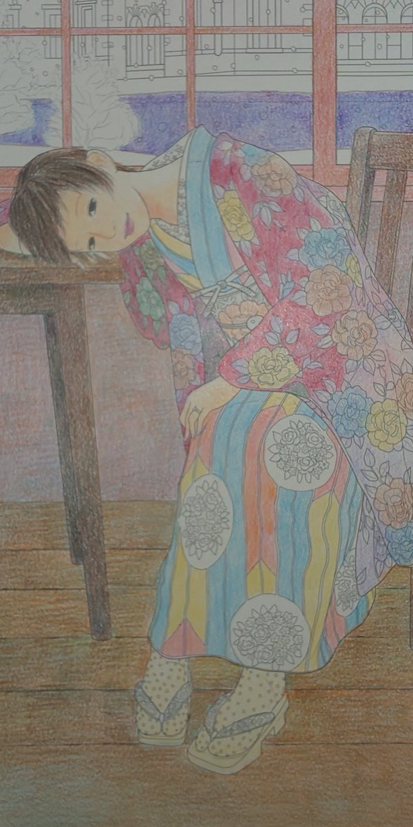 明けましておめでとう御座います🐯今年も宜しくお願いします❤️@hinamokuren #着物姿の乙女たち #大人の塗り絵プレミアム #加藤美紀 #大人のぬりえ #大人の塗り絵 #色鉛筆 #polychromos 楽しく塗っていきます〜♫