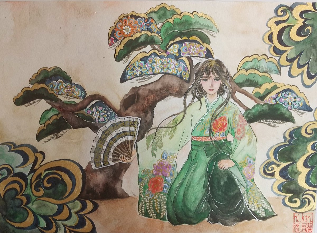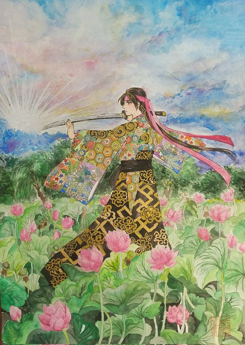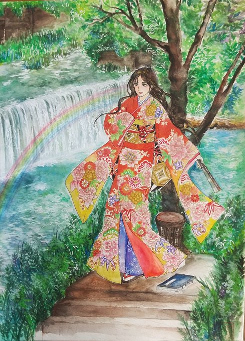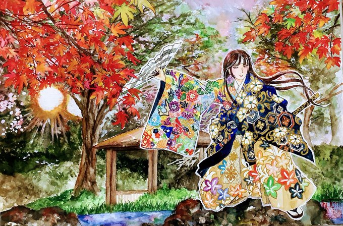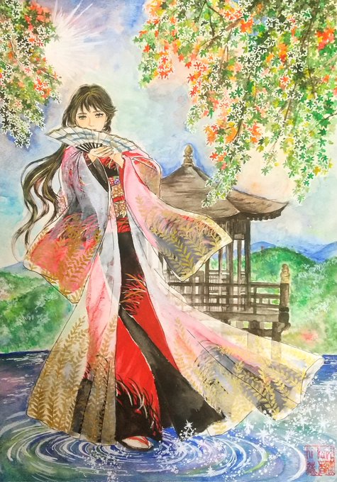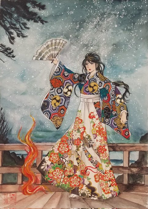 "うつりゆく 季節流れる 時に乗り 心を燃やし 扇をかざす" 私の大切な友人の一人、はるみさんの見事なお着物とかつぎを描かせて頂きました。 はるみさん、ありがとう。 #illustrationart #watercolour #artwork #水彩イラスト #絵描きさんと繫がりたい #illustration #短歌 #水彩画 #煉獄さん twitter.com/lmO7f9nEgLsT…