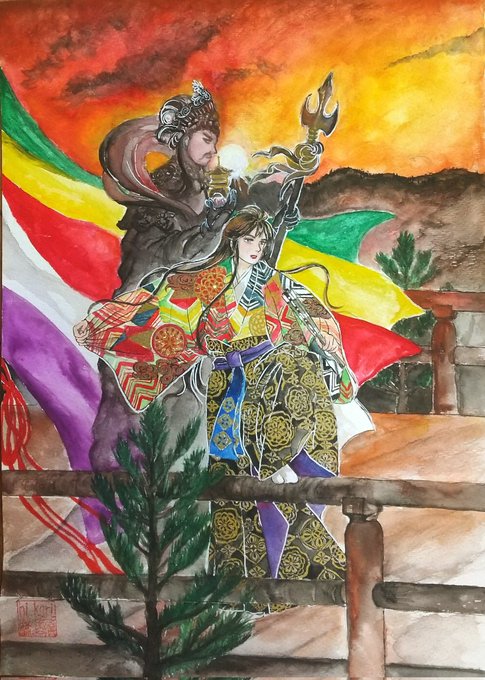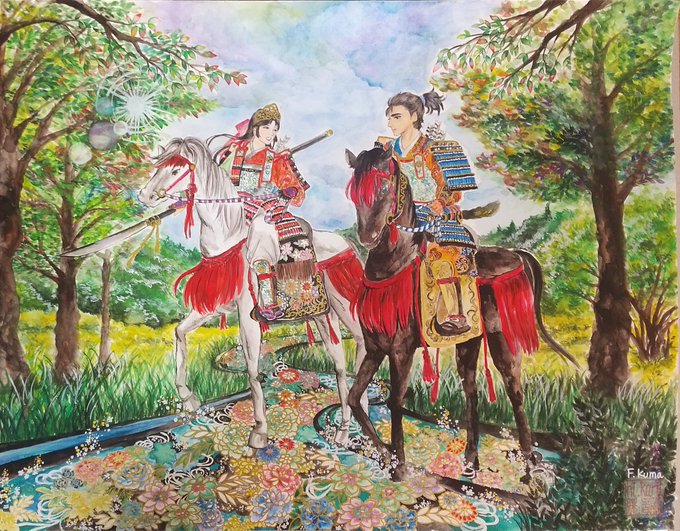 「木曽義仲公と巴御前」 "いくさ場も 君がいてこそ 笑み交わし 三途の華を 共にて渡る" 歴史に精通し、鉛筆画の絵師でもあるえぞっくまさん(@ezo02kuma02)と、共同制作しました。 えぞさま、ありがとうございました。 #illustrationart #watercolour #水彩イラスト #illustration #短歌 #水彩画 twitter.com/ezo02kuma02/…
