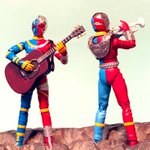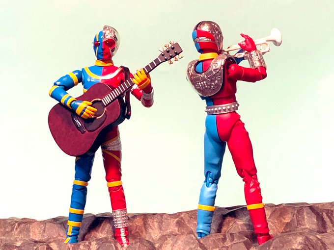 #おもちゃ撮影会 1/25 テーマ「石ノ森章太郎」 #石ノ森章太郎生誕記念日 と言う事でギターとペットでお祝い。 2人が楽器を持ってる理由が光明寺博士の音楽好きなのを漫画で描いてるのが印象的だった。