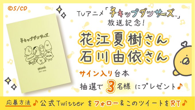 🍗フォロー&RTキャンペーン🍗 TVアニメ「#チキップダンサーズ」放送記念🎉 #花江夏樹 さん #石川由依 さんのサイン入り台本 抽選で3名様にプレゼント✨ ▼応募は10/14~11/5 ①@chickipdancers をフォロー ②このツイートをリツイート くわしくはこちら▽ san-x.co.jp/blog/toretate/…