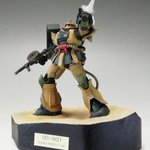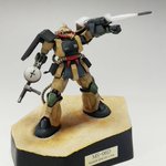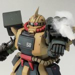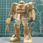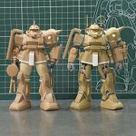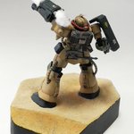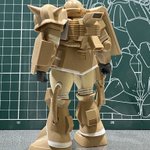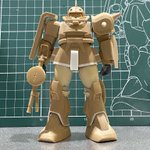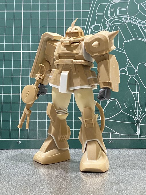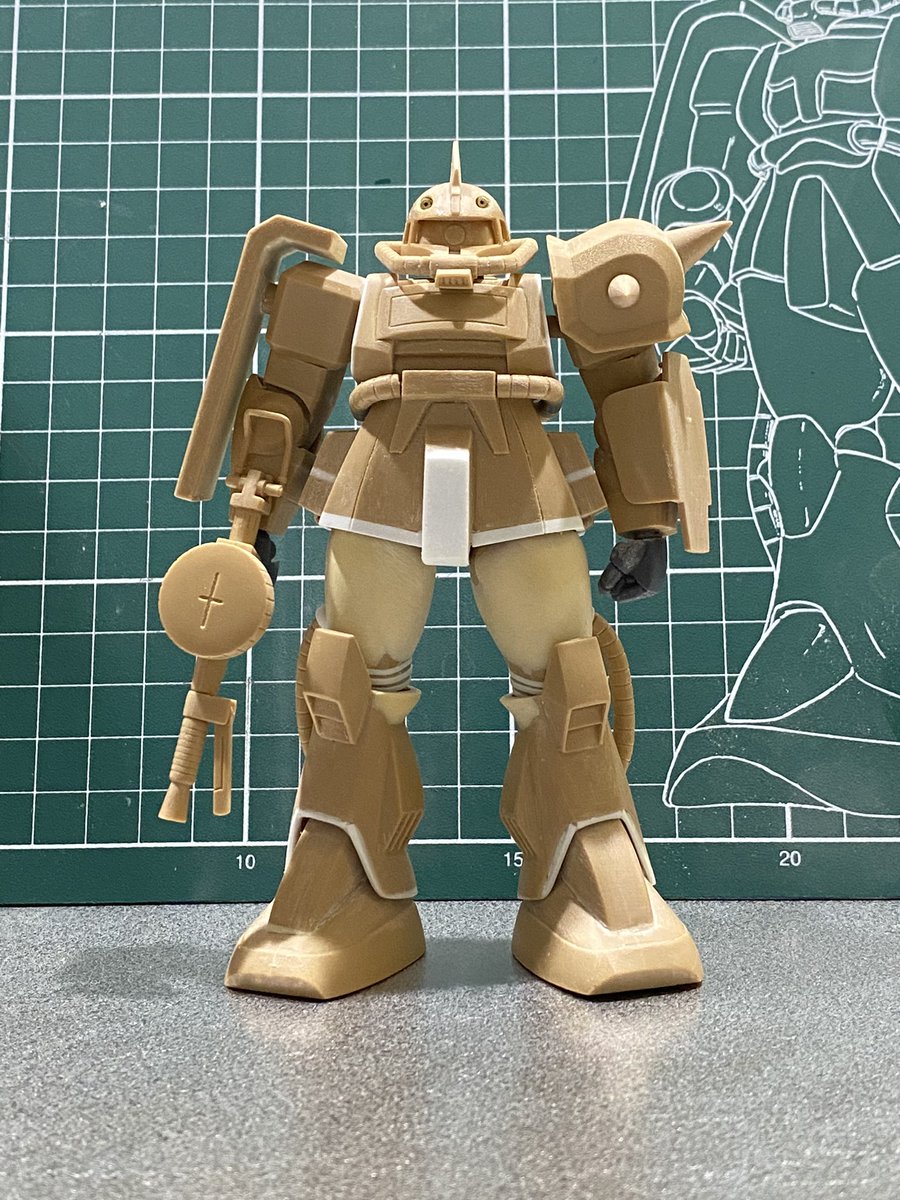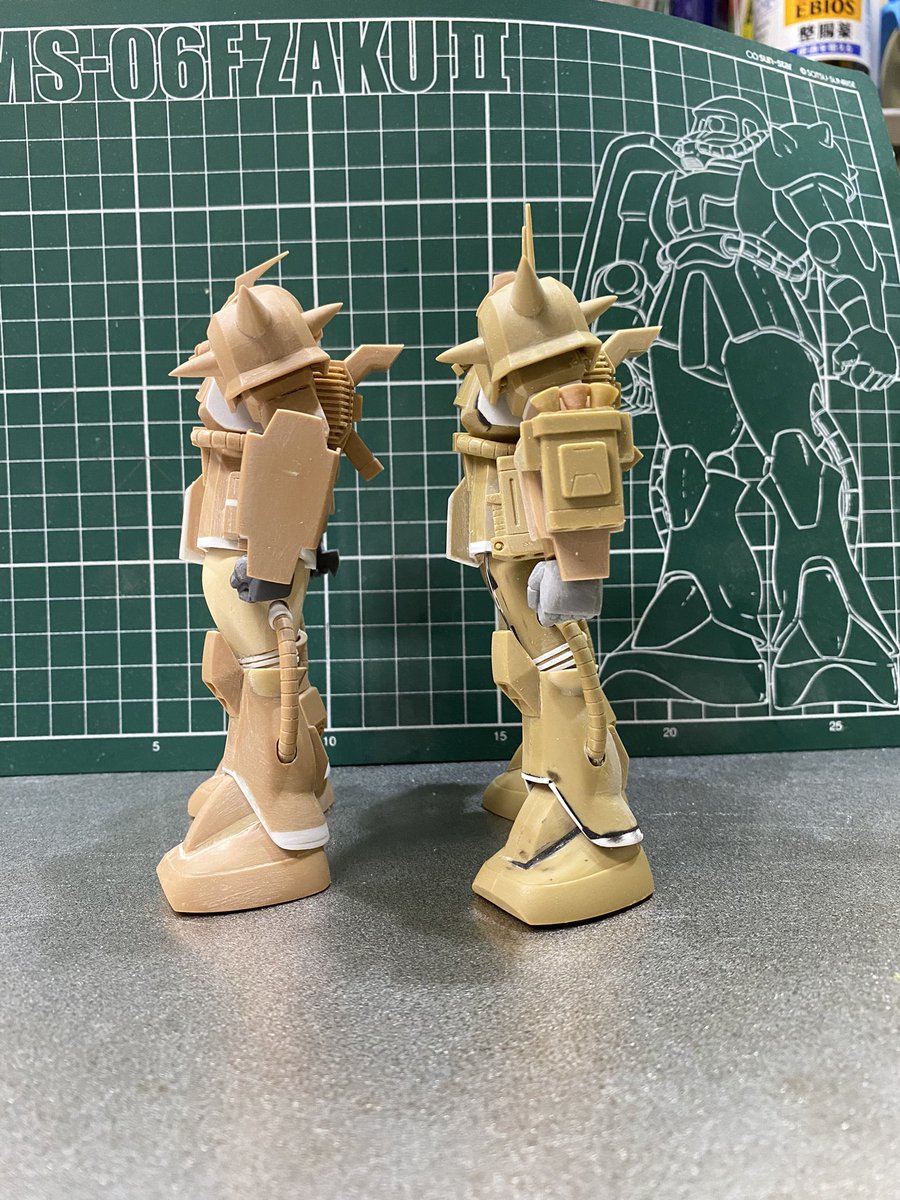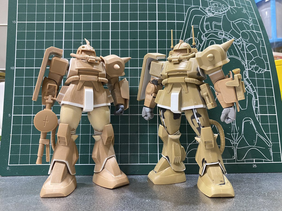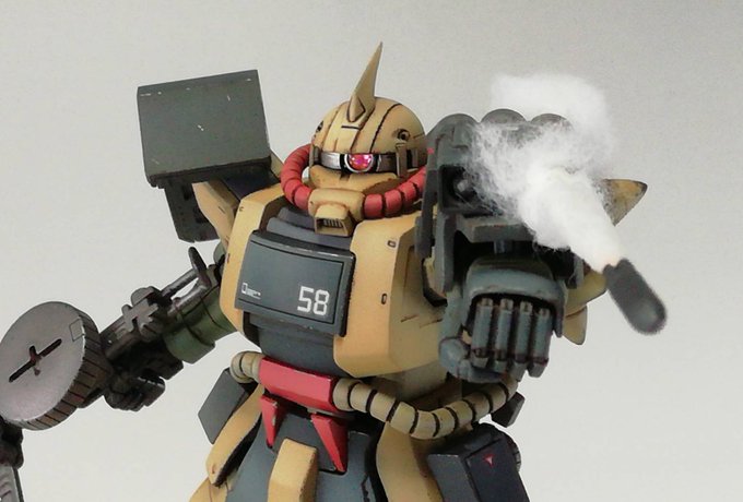 #白背景でも撮ってみた カラーレシピは引用元に😭 両肩をスパイク化、寄せ集めパーツで左前腕にショートバレルガトリング😭 缶スプレー×マスキングシートによるスプリッター迷彩・・・実は上腕と太腿だけ色の組み合わせが違います😏 #ガンプラ #GUNPLA #HGTO #ザク #デザートタイプ #砂ザク twitter.com/gajumaru_museu…