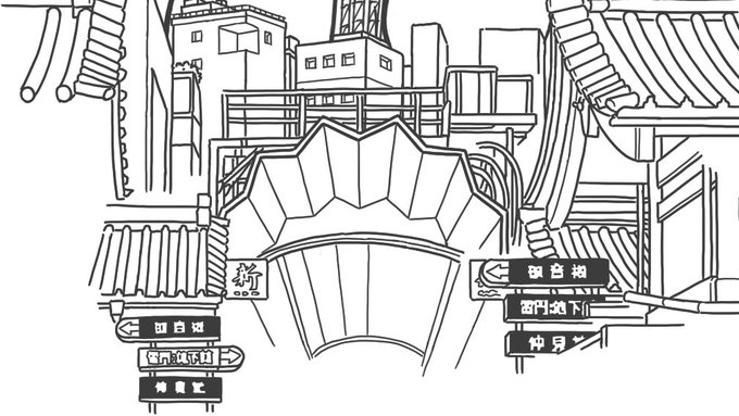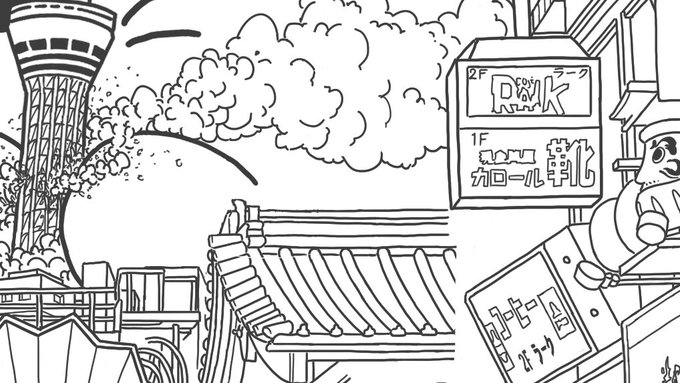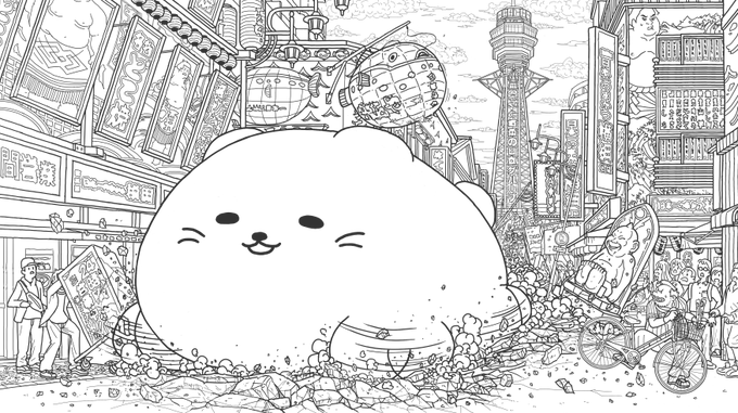 「大阪、通天閣付近を破壊する猫」の 線画バージョン #イラスト好きさんと繋がりたい #絵描きさんとつながりたい #誰かの推し作家になりたい #私の絵が好きそうなフォロワーさんにRTして届けておくれ絵 #通天閣 #大阪 #破壊する猫 #猫 #猫好きさんと繋がりたい