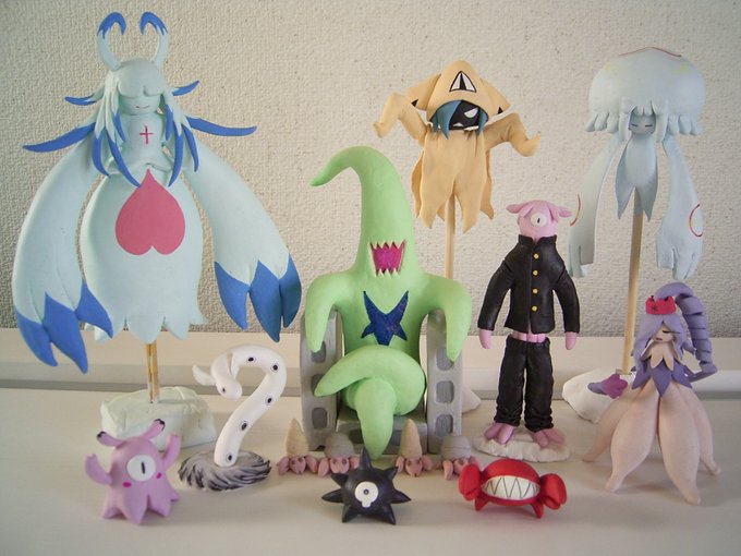 なんとかギリギリ間に合いいあいあ!紙粘土フィギュアによる6邪神+レギュラー3無位+コピーマグちゃんです。10体の総製作期間は2カ月ちょい・200時間位です!上木先生いつまでも心に残る素敵な作品有難うございました!9巻発売までまだまだマグちゃんの推し活進めます! #破壊神マグちゃん混沌芸術祭