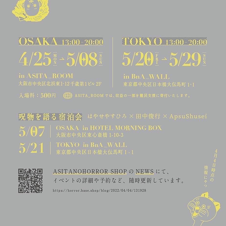 5/20(金)〜 #祝祭の呪物展 東京スタートします! 日本橋にあるアートホテル"BnA_WALL"にて開催! ASITA_ROOMとは違った雰囲気の会場となっております✨ webshopも開催と同時に更新します!お見逃しなく! 詳しくは↓↓↓↓ horror.base.shop/blog/2022/04/0…
