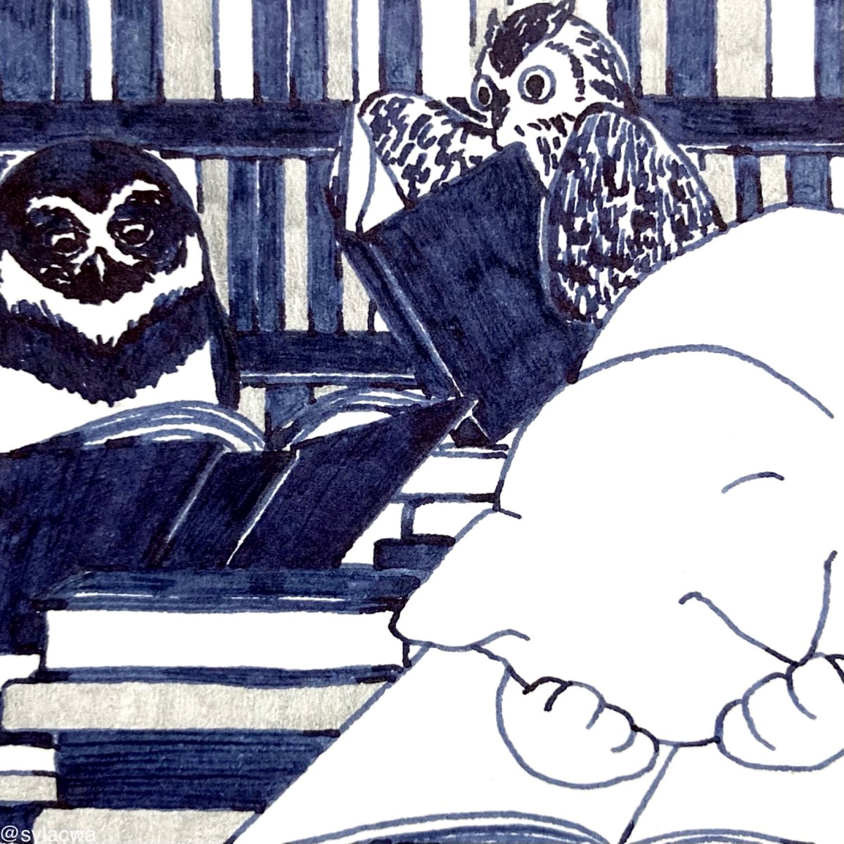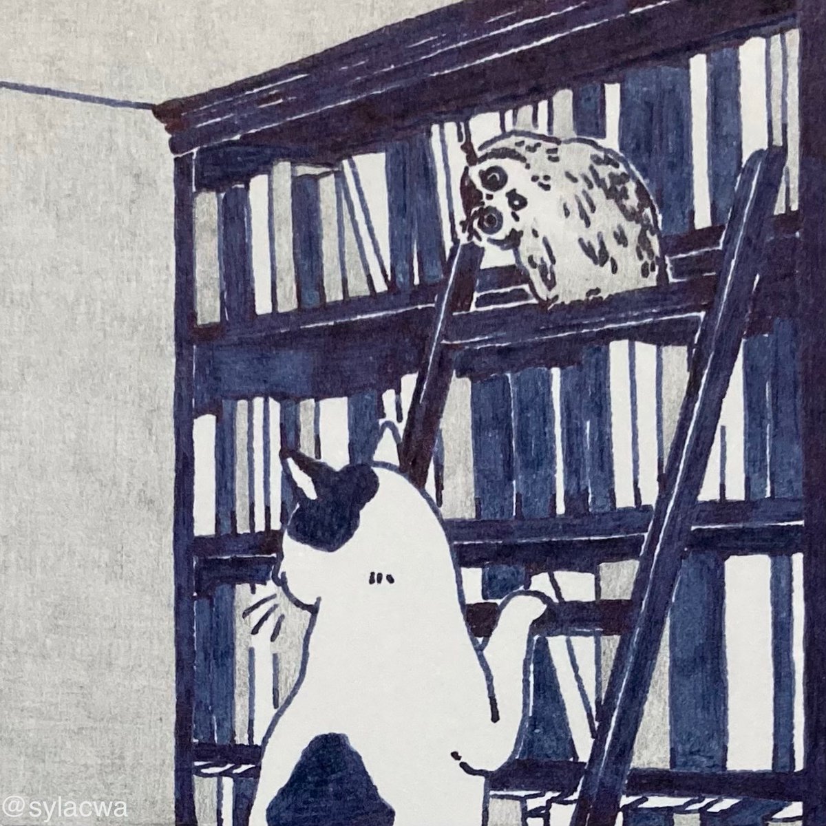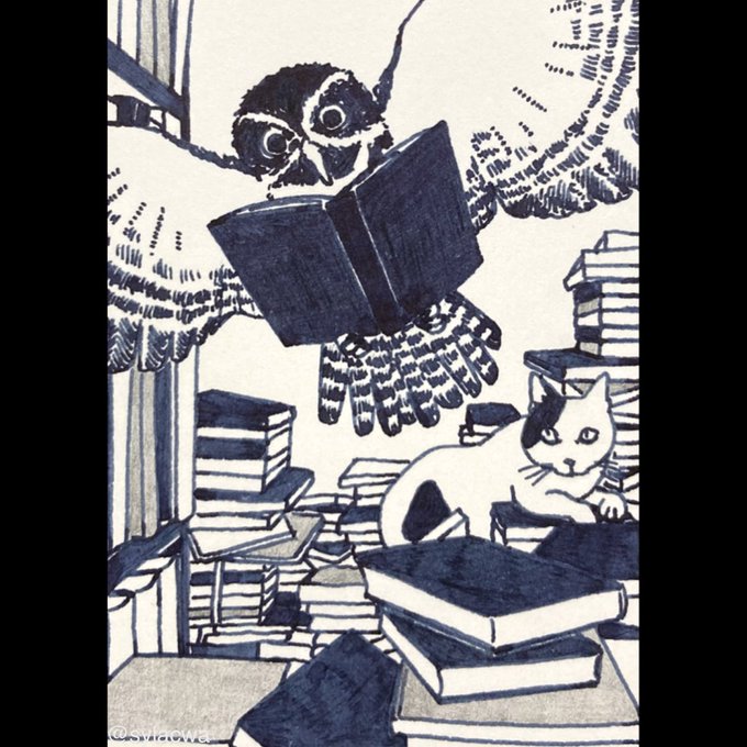 シル、シルとミシラヌ #神保町 といえばの📖 その3 #ペン画 #絵 #猫 #inkdrawing #pendrawing #フクロウ #本 *3/19,20 猫画個展@神保町* ちょうど神田古本まつり会期中のよう📖