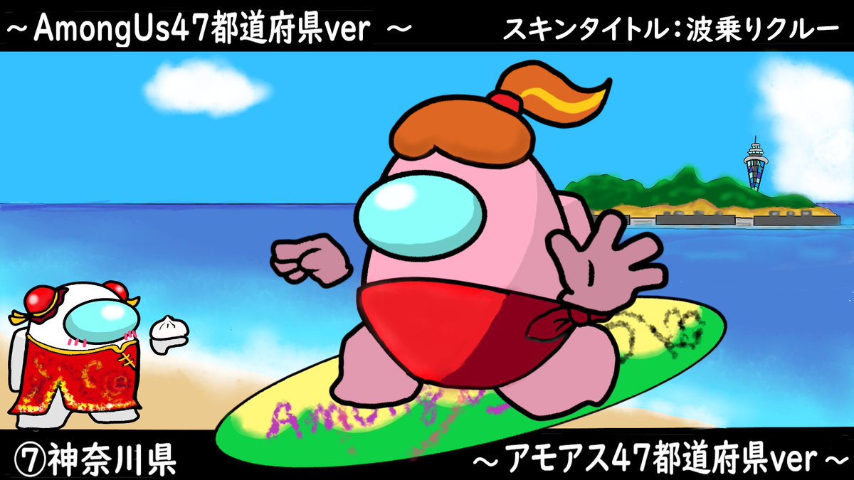 【しのチャレ】 7番目もリクエスト頂きました、神奈川県! 江ノ島に波乗りクルー(陸サーファー) あと中華街といえばチャイナ!? スリットスリット♥ #しのチャレ #アモアス47都道府県ver #アモアス偉人ver #神奈川県 #AmongUsFanArt #AmongUs #illustration #イラスト