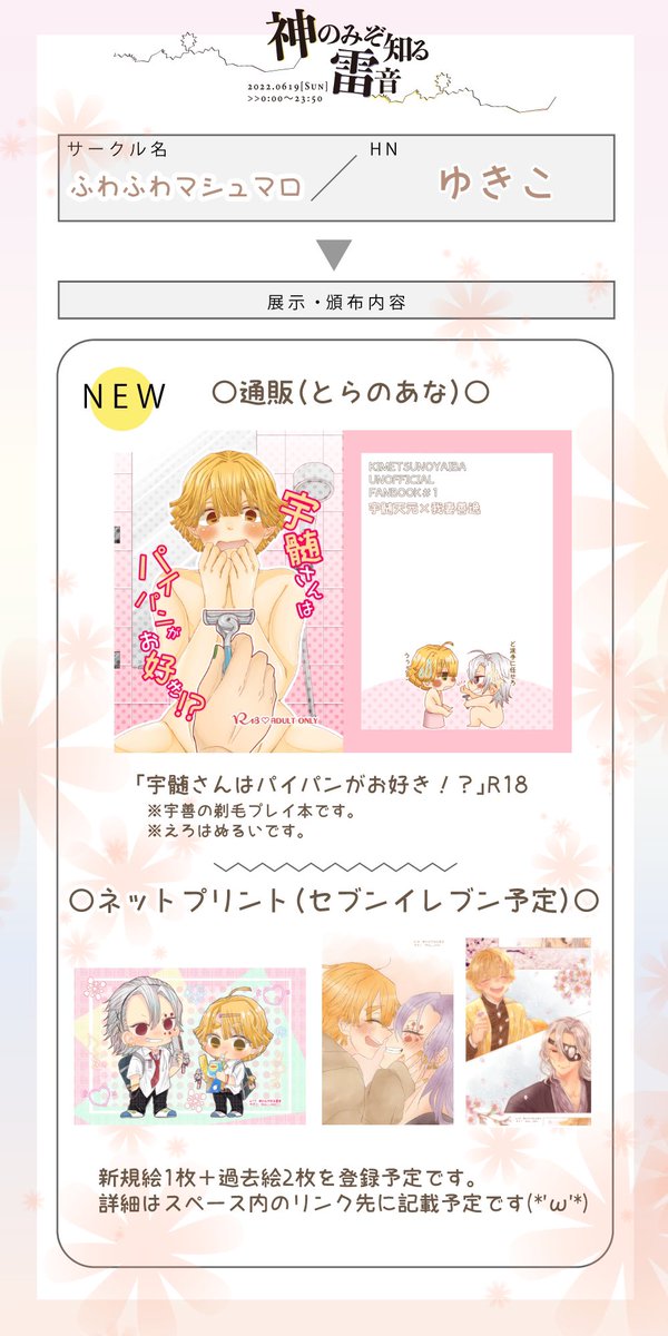 #神雷0619 #宇善WEBオンリー お品書きです。 既刊をとらさんにて通販、展示は昨年発行の既刊よりWeb再録があります❗️ 当日スペース真ん中の本からリンク予定です😆 使い方分かってないので挙動不審かもしれません😂