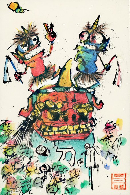 「おにっぺと唐津くんち」(墨彩画) 唐津くんちは佐賀県唐津市のお祭りです☺ #フォロワー10万人以下の絵師が力作を投稿してたくさんのフォローを貰うタグ #イラスト #妖怪 #鬼 #ジブリパーク開園 #いいねで気になった人フォローする #秋の創作クラスタフォロー祭り #祭り