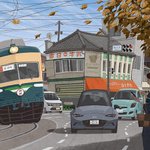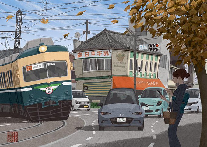 『福井鉄道・商工会議所前駅』…福鉄名物、路面を走行する大型電車。最近次々に低床車両に置き換えられ、この風景もいつのまにか過去のものになりました。 #Illustration #Illustrator #電車のある風景 #福鉄 #福井鉄道