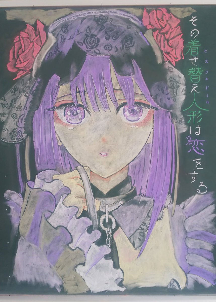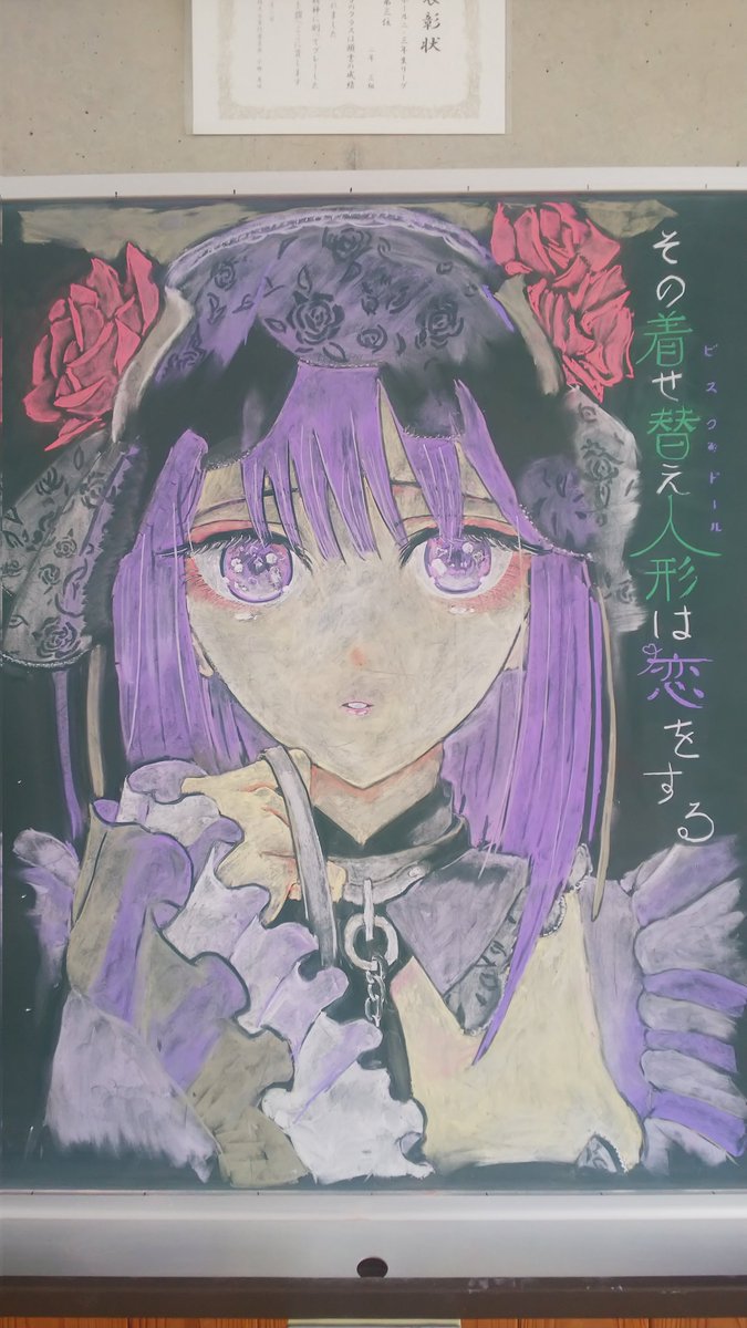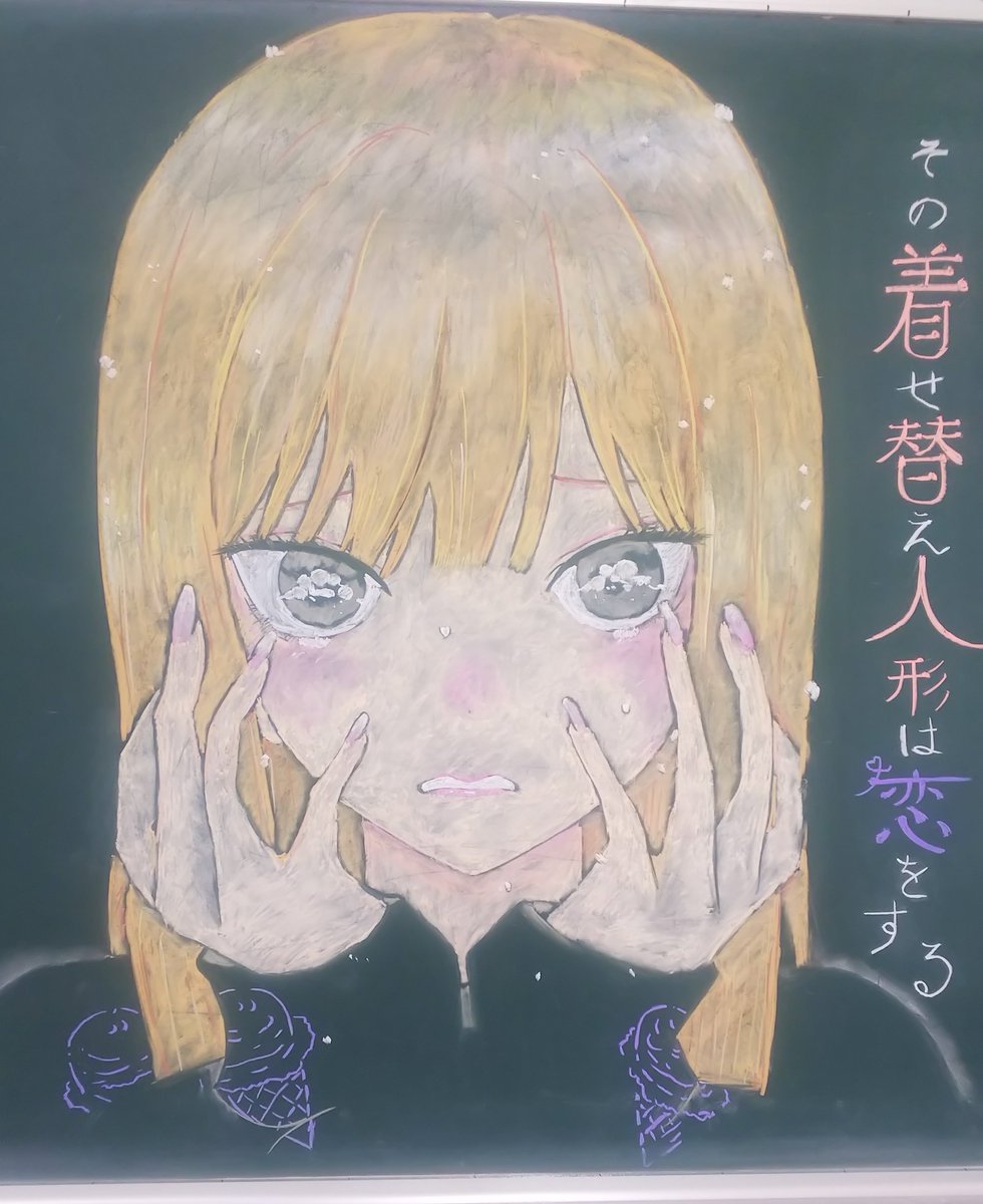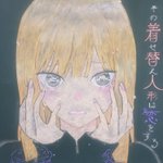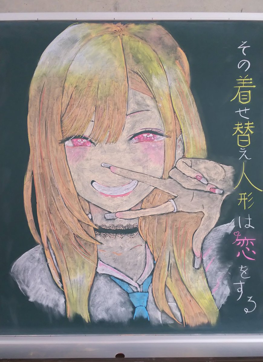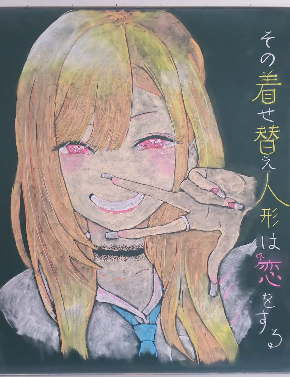 次の黒板アート何にしようか悩んでいたら、「#その着せ替え人形は恋をする」の海夢ちゃんの誕生日ということなので、海夢ちゃんのコスする(性奴隷🤭)雫たん描いてみました😊 3枚目は過去の😘 新潟は来週からまん防明けて、部活の制限も緩和されそうです😀 #着せ恋 #福田晋一 #喜多川海夢生誕祭2022