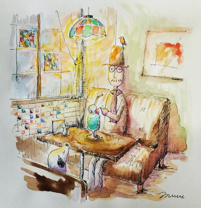 ❁.。.:*:.。.✽.。.:*:.。.❁.。.:*:.。.✽.。 こんにちは 私のオジサン クリームソーダの色がキレイ 喫茶店もレトロで素敵ね*.∗̥ ❁.。.:*:.。.✽.。.:*:.。.❁.。.:*:.。.✽.。 オジサン誕生秘話↓ muumuumuuart.com/980 #私のオジサン #絵本 #イラスト #絵描きさんと繫がりたい