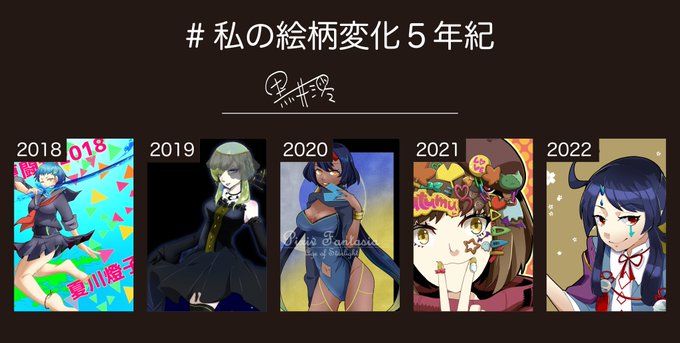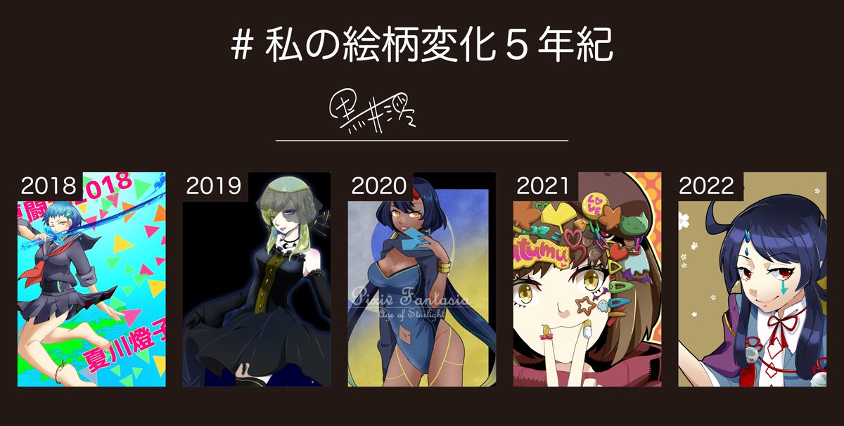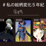 #私の絵柄変化5年記 これもいつぞやにほぞんしていたやつをやってみました〜 2018と2020がアナログ線画&アイビス、2019がアナログ(色鉛筆塗り)をスキャン、2021からはプロクリエイト デフォルメを始めたのは2019、確立させたのは2020だったなぁ確か