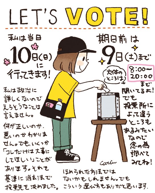 #投票ポスター2021 に向けて描かせていただいたポスター、コンビニネットプリントも登録しました。お家にプリンターがない方も、ぜひ。 #選挙に行こう #私も投票します セブンイレブン予約番号:66851964 ファミマ・ローソンユーザー番号:5YKNW2J2U6