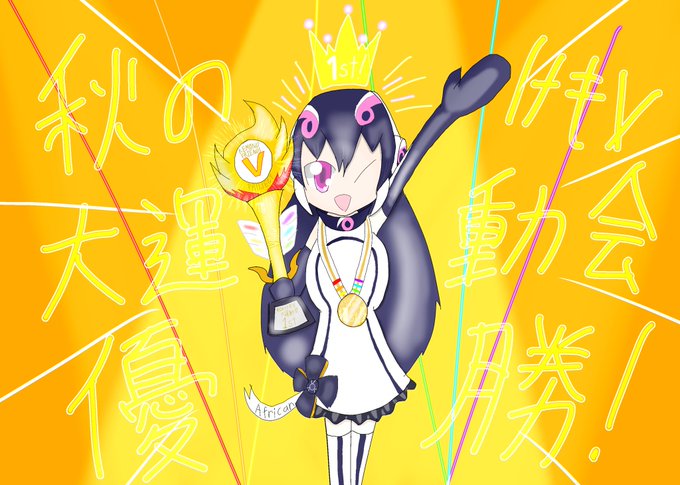 #秋のけもV大運動会 #ケープペンギンちゃんねる #けーぷあーと ラストは色々アレだったけど…。 と、とにかく!ケープちゃん優勝おめでとう! 優勝お祝い記念のイラストです! あげようとしてたメダルとトロフィーも一緒にね!