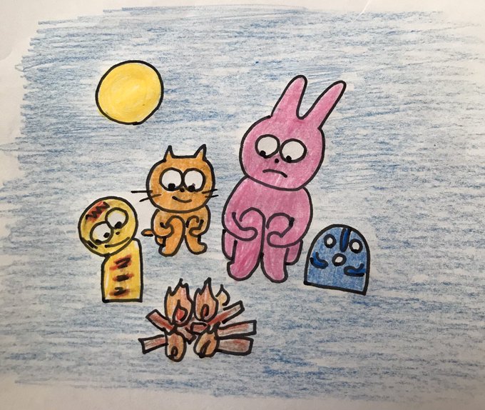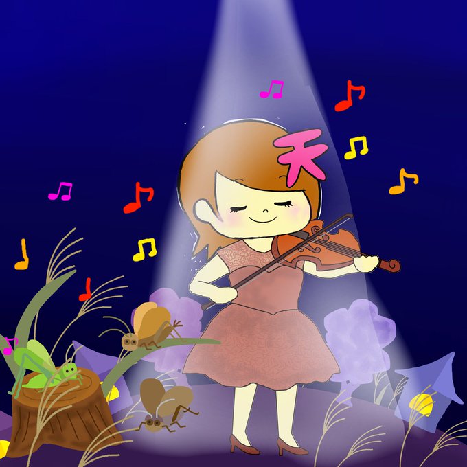 天テンちゃんがバイオリンを弾いていると 鈴虫、コオロギたちも参加で大合唱♪♬♩♫ #秋の思い出 #秋の夜 #鈴虫 #illustration #イラスト #イラスト好きな人と繋がりたい #絵描きさんと繋がりたい #ゆるいイラスト