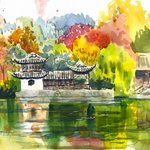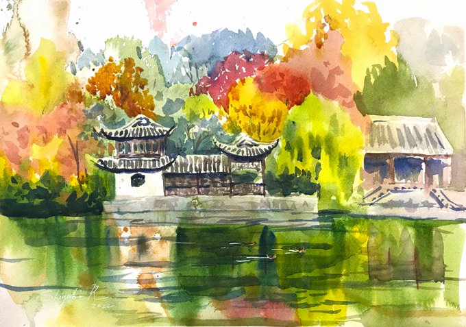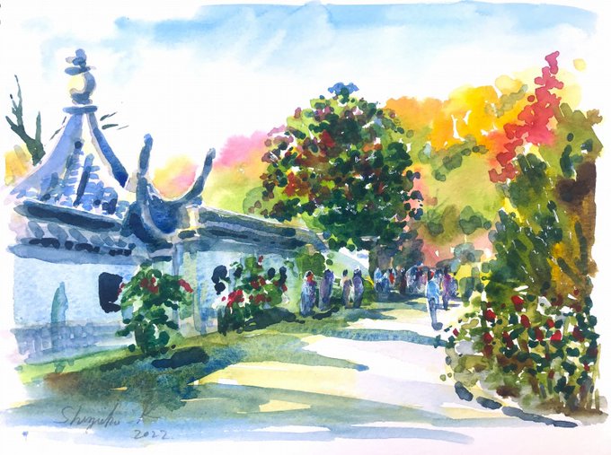 透明水彩スケッチ「秋バラの咲く道」鶴見緑地中国館界隈F1サイズ 気温20度の秋晴れ。遠足の子供達に、散歩をする人々。大勢の人たちが行き交う脇で描きました。 #透明水彩画 #透明水彩 #水彩画 #水彩 #スケッチ #watercolor #aquarelle #sketch #風景画 #landscape #鶴見緑地公園 #中国館 #秋の絵