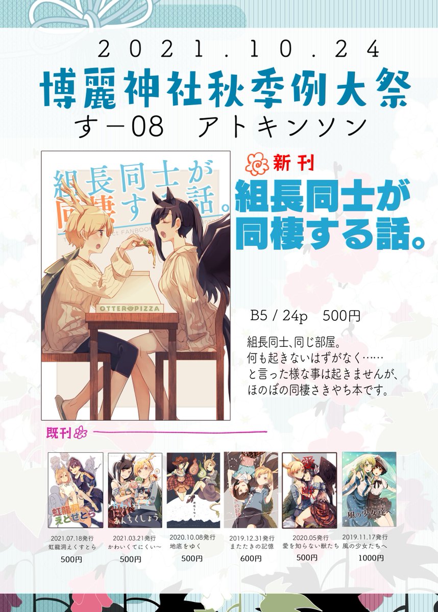 秋季例大祭、紅楼夢新刊の宣伝です! みすちーののこりゆおじや A5 30p 500円 幽々子とルーミアがみすちーの残り湯でおじやを作ろうと奮闘する話です? 例大祭:こ22a、紅楼夢:A-08です メロンさんで委託しております! melonbooks.co.jp/detail/detail.… #ミスティア・ローレライ #秋季例大祭 #東方紅楼夢
