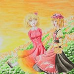 水彩色鉛筆で、夕暮れの中帰路に就く秋姉妹を描きました! #秋の創作クラスタフォロー祭り #絵描きさんと繫がりたい #東方Project #秋静葉 #秋穣子 #水彩色鉛筆 #イラスト初心者