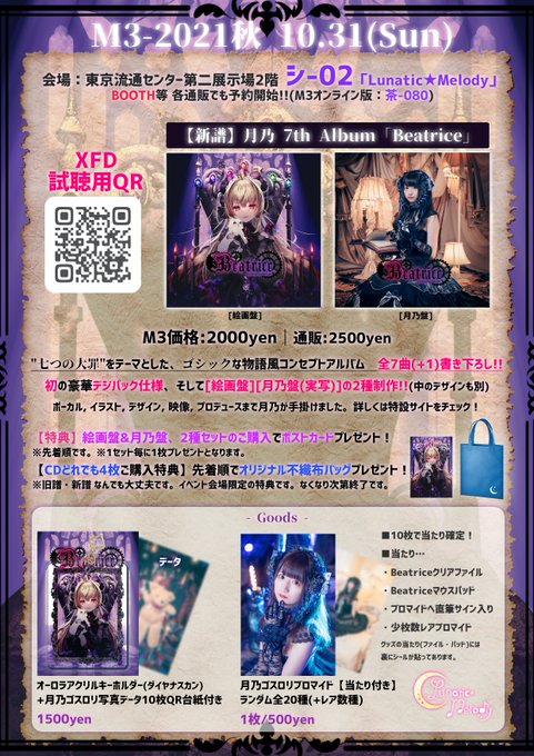 【M3-2021秋 お品書き&特典】 2021.10.31(日) リアル会場:TRC第二展示場2Fシ-02 WEB会場:茶-080 Lunatic★Melody ┈┈┈┈ ⚜️新譜│月乃7th Album「Beatrice」 XFD:youtu.be/fpiJW7oCUfs 特設:lunaticmelody.wixsite.com/lunamelo/beatr… 通販:tsukino.booth.pm ┈┈┈┈ #M3 #M3秋 #秋M3 #月乃Beatrice