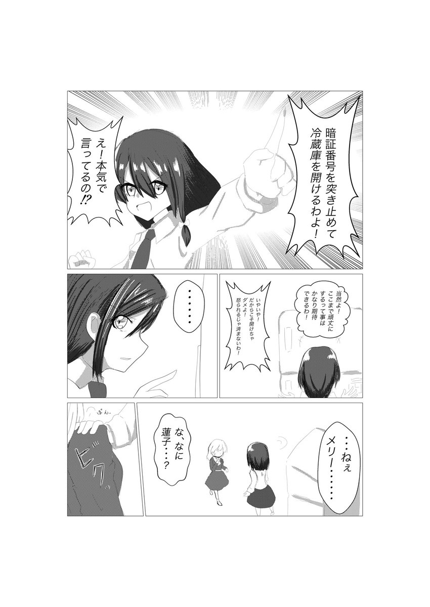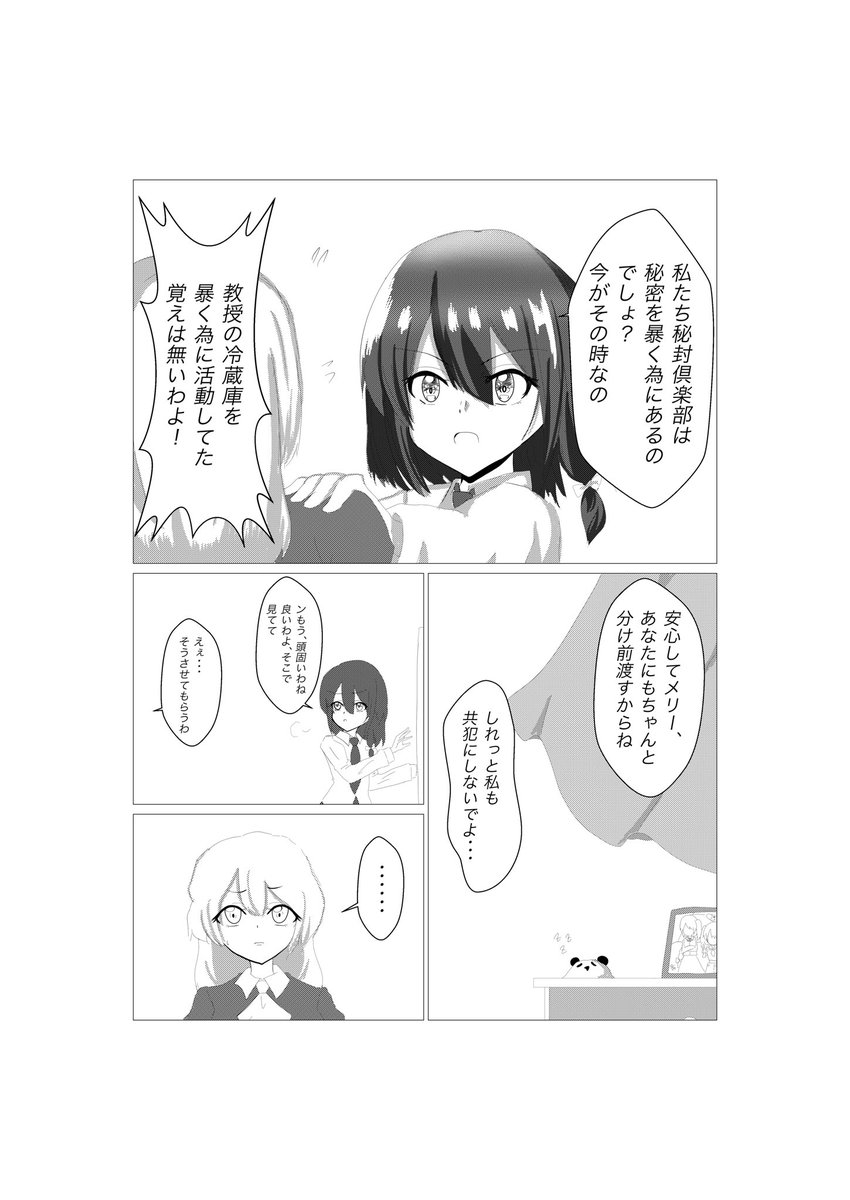#科学世紀のカフェテラス #京都秘封 京都秘封の新刊です。[封−13 げてものしょくどう] 蓮子とメリーとちょっと夢ちゆが出る本になります。 岡崎夢美が冷蔵庫に厳重に保管したスイーツを蓮子が狙うお話になってます。蓮子ちゃんは無事スイーツを手に入れられるのか… よろしくお願いします〜