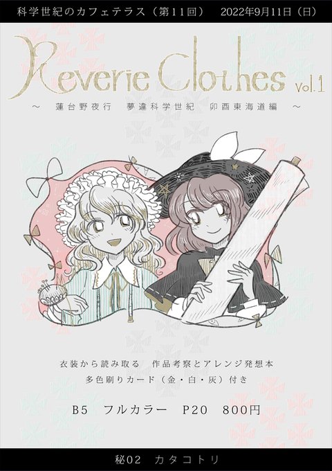 #科学世紀のカフェテラス 京都秘封の新刊告知です!今回はイラスト本作りました! この本のために描きおろした12種のイラストを収録しています。収録キャラクターは蓮子とメリーのみです。 表紙まわり込み全20ページ、B5サイズ、500円で頒布予定です。よろしくおねがいします!