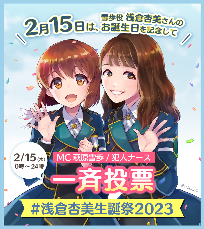 明日、2/15は浅倉杏美さんのお誕生日です! 記念に一斉投票が開催されますので、 先日ライブにも出演されたあずみんへ、お疲れ様&ありがとうの想いも一緒にお祝いしましょう~🎉 #浅倉杏美生誕祭2023 #ミリオンキャスティング #犯人ナース雪歩 #雪歩は黙秘ってて #穴掘って埋めちゃいますぅ